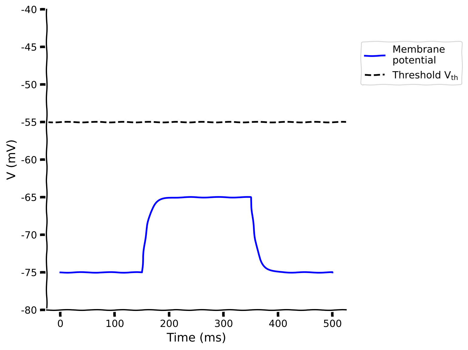 plt.legend(['Membrane\npotential', r'Threshold V$_{\mathrm{th}}$'],