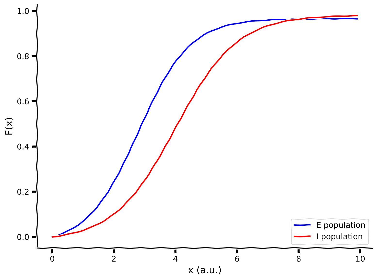 Plot the frequency-current (F-I) curves for both populations (i.e., E and I).