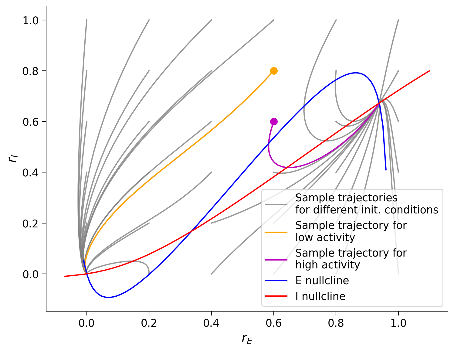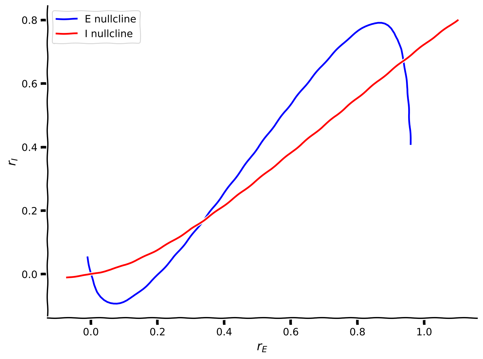 That is, the blue nullcline divides the phase-plane spanned by \(r_E, r_I\) into two regions: on one side of the nullcline \(\displaystyle{\frac{dr_E(t)}{dt}} > 0\) and on the other side \(\displaystyle{\frac{dr_E(t)}{dt}} < 0\).