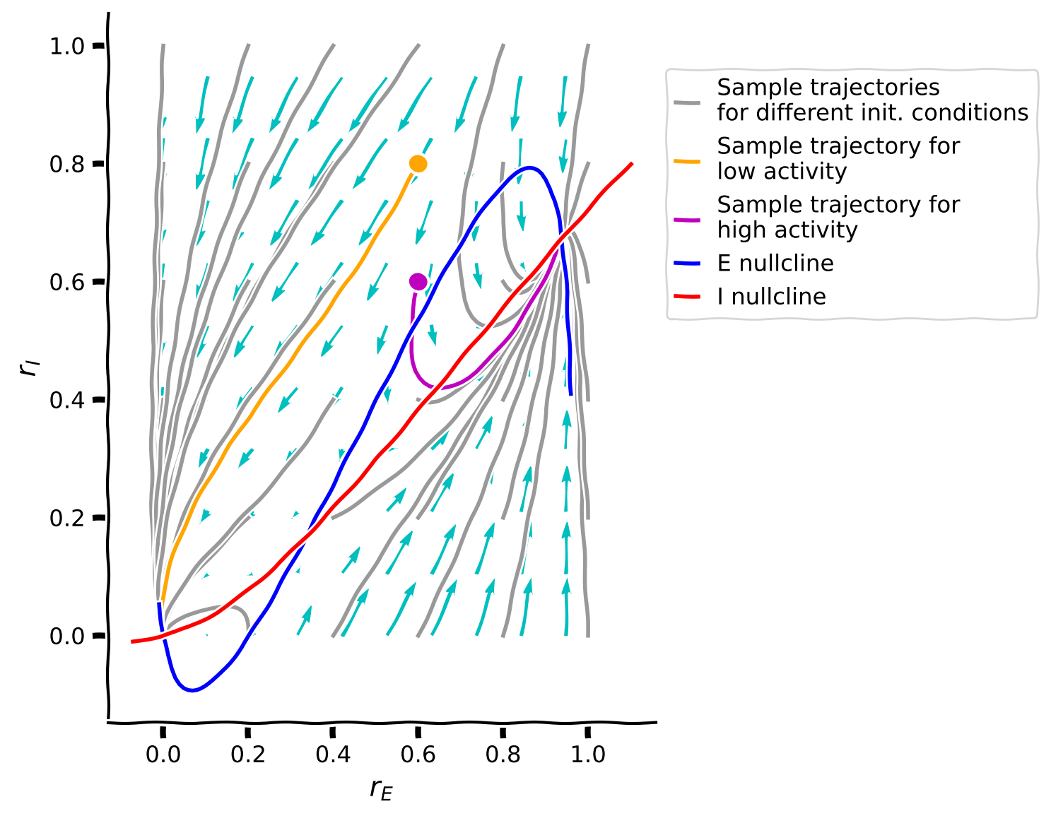 The map of tangent vectors in the phase plane is called vector field. The behavior of any trajectory in the phase plane is determined by i) the initial conditions \((r_E(0),r_I(0))\), and ii) the vector field \(\bigg{(}\displaystyle{\frac{dr_E(t)}{dt},\frac{dr_I(t)}{dt}}\bigg{)}\).