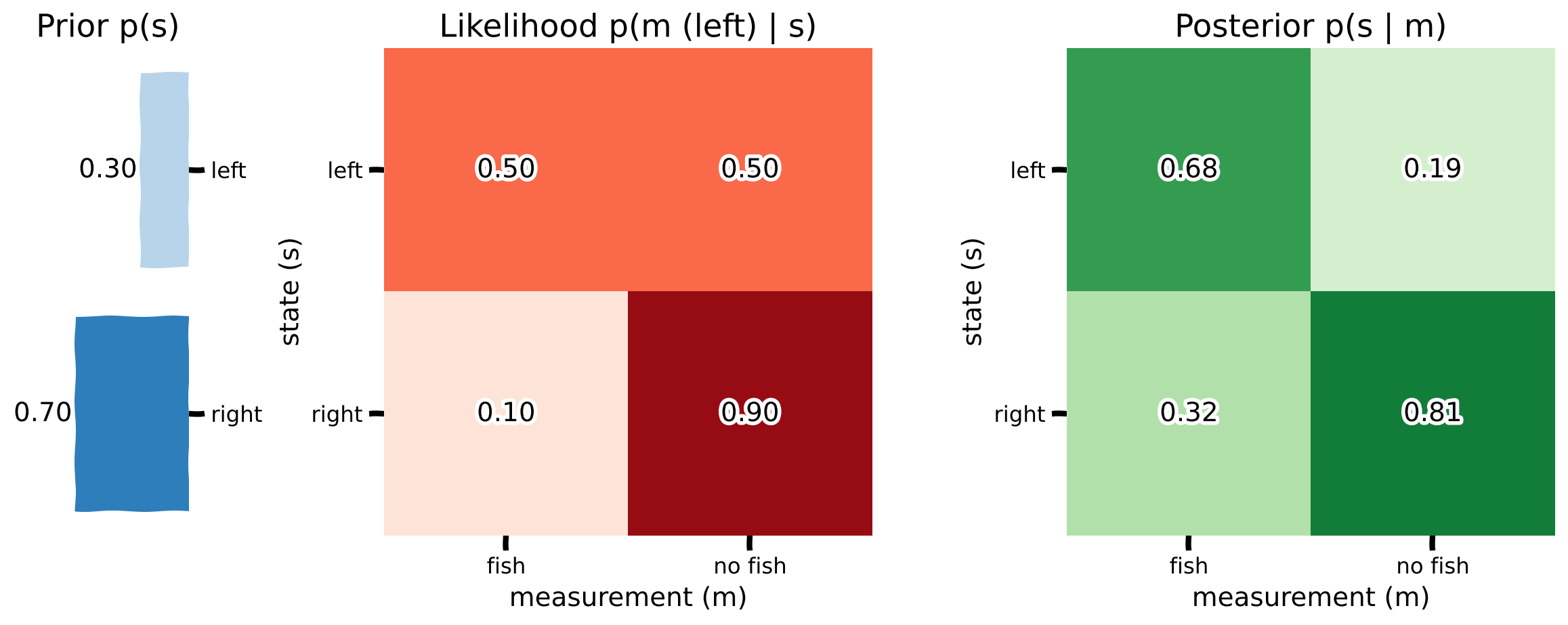 As before, our prior is \(p(s = \textrm{left}) = 0.3\) and \(p(s = \textrm{right}) = 0.7\). In the video, we learned that the chance of catching a fish given they fish on the same side as the school was 50%. Otherwise, it was 10%. We observe a person fishing on the left side. Our likelihood is: