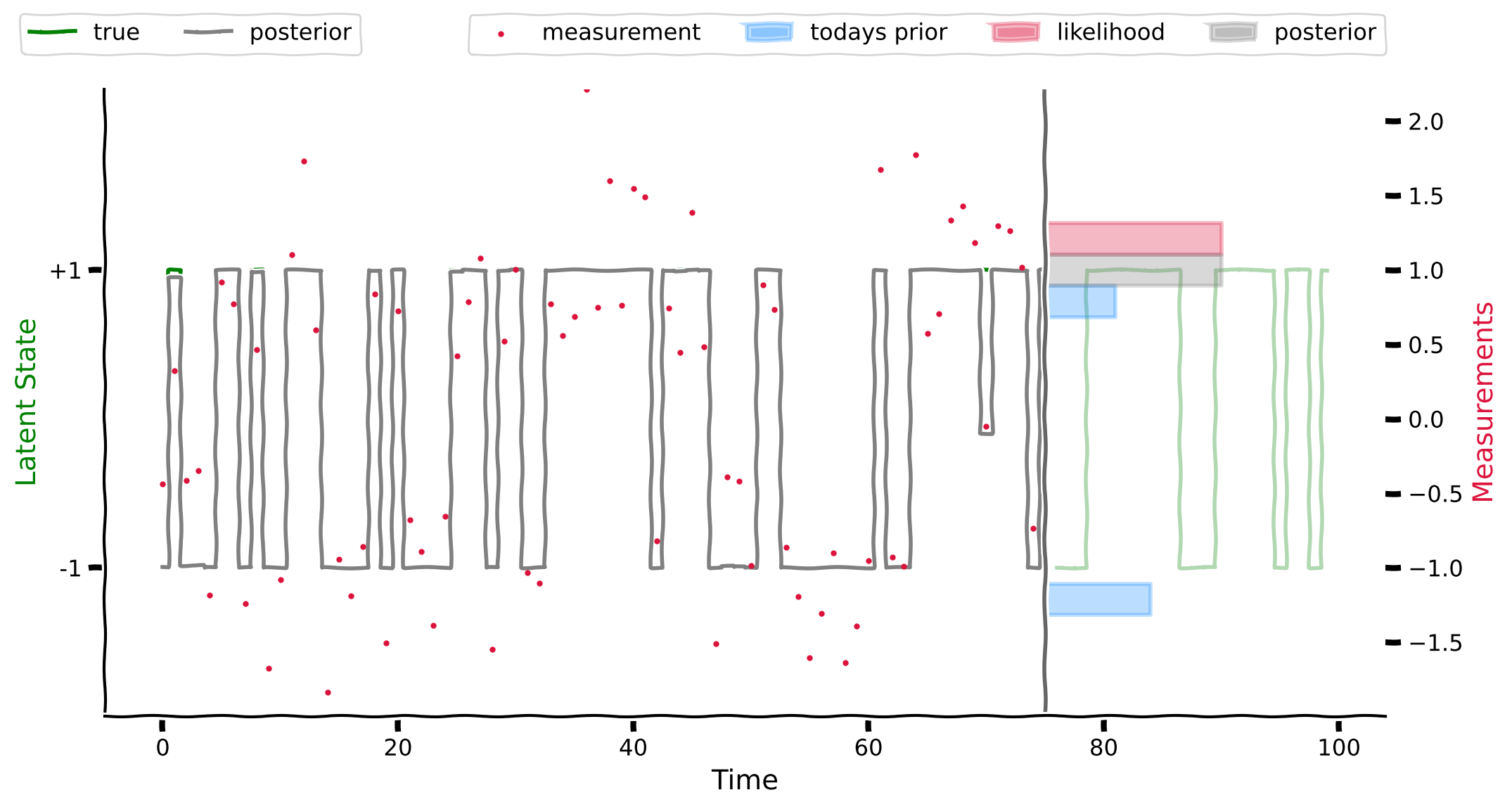 # global model, measurements, states, states_inferred, predictive_probs, likelihoods, posterior_probs